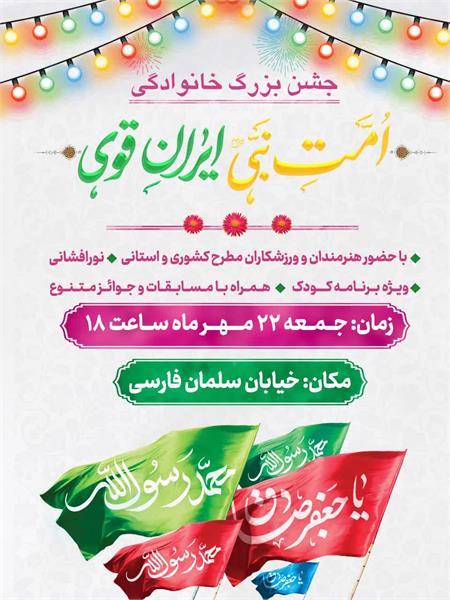 بصیرت نو خوزستان : به گزارش روابط عمومی اداره کل فرهنگ و ارشاد اسلامی خوزستان، همزمان با سالروز ولادت با سعادت پیامبر اکرم صلیالله علیه و آله وسلم و امام جعفر صادق علیه السلام، با همکاری دستگاههای مختلف اداری و فرهنگی استان جشن بزرگ خانوادگی «امت نبی، ایران قوی» در خیابان سلمان فارسی (نادری) اهواز برگزار میشود.